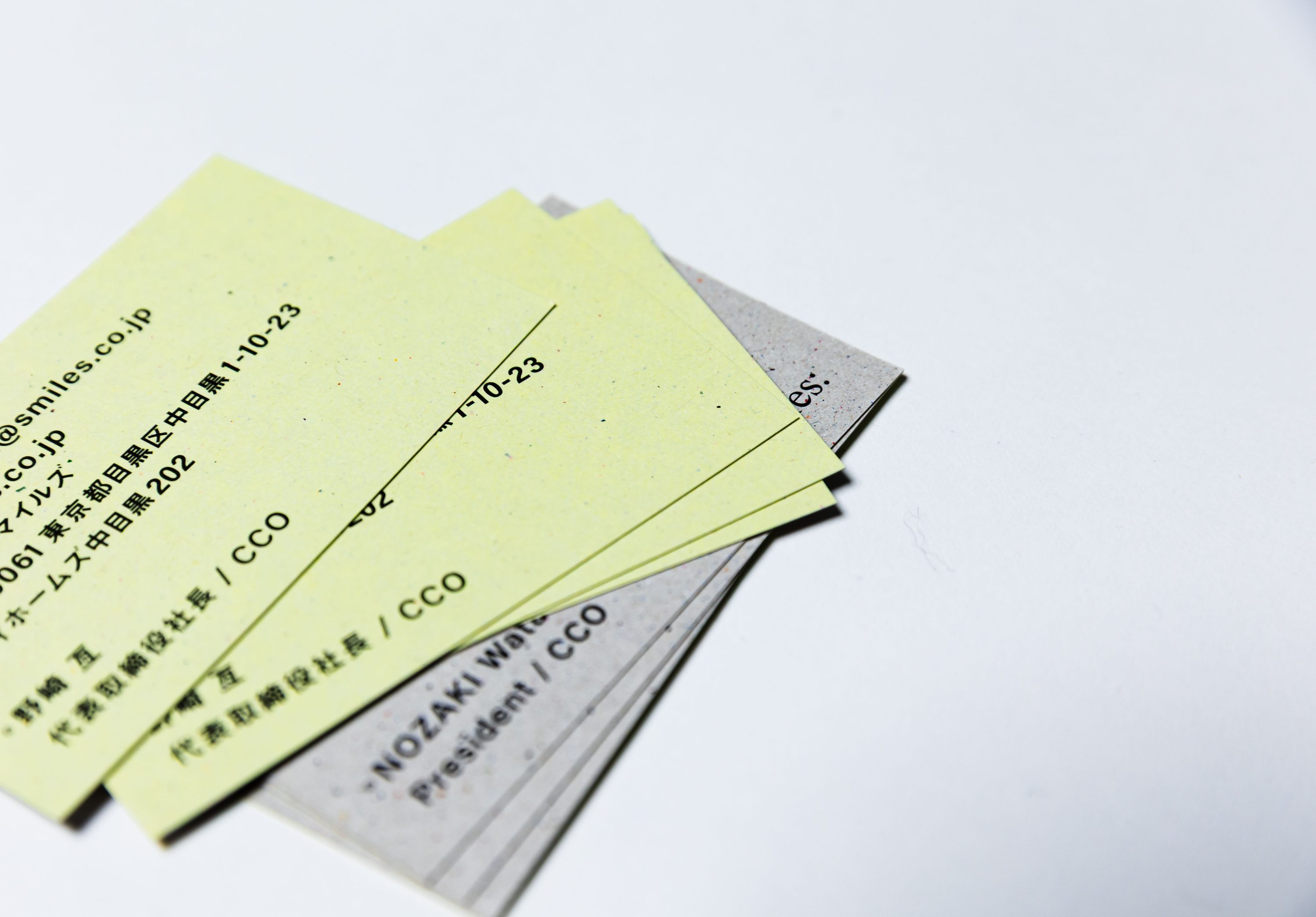 スマイルズの紙ゴミを再利用してつくった「古紙イエロー」の名刺。